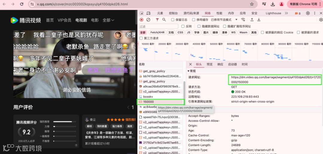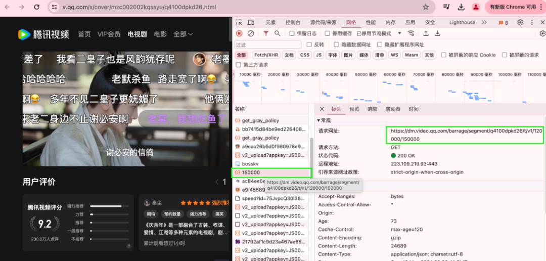 打开开发者工具,播放视频,观察Network中的请求,其中绿色框中的120000、150000之类的就是弹幕请求。