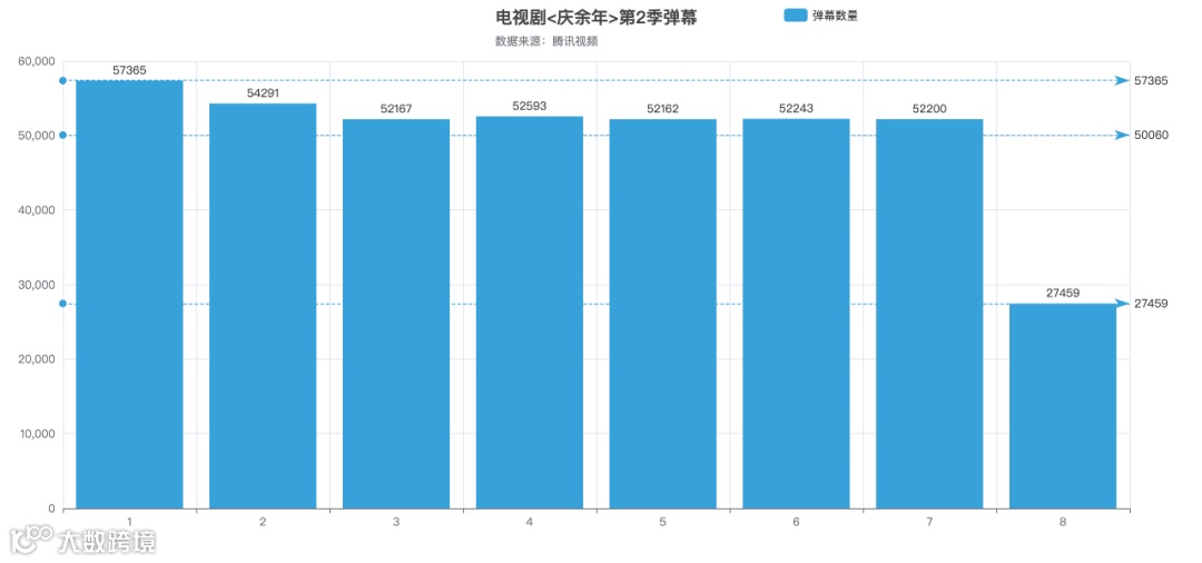 使用 pyecharts 可视化库统计每一集视频弹幕数量,观察上图可知,第 1 集弹幕最多有 57365 条,第 8 集弹幕最少有 27459 条(昨晚刚更新,数量还在增加中),平均每集有 50060 条弹幕。
