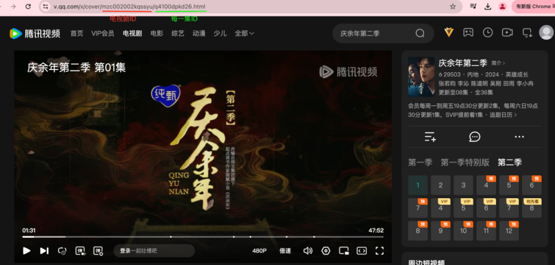 首先我们使用浏览器进到《庆余年》第二季任意一集的播放页面,在浏览器地址栏可以获取该剧集的视频URL地址,该URL一般来说由电视剧ID和每集ID组成,如下所示: