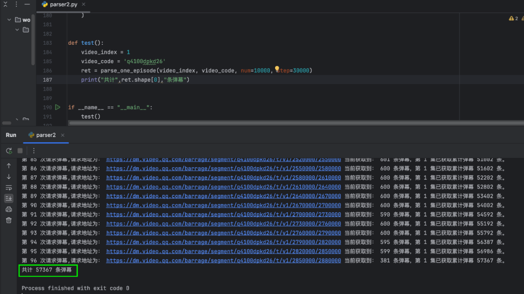 def parse_one_episode(video_index,video_code,num=10000,step=30000):# episodes_danmu_DataFrame是存放一集所有弹幕的DataFrameepisodes_danmu_DataFrame = pd.DataFrame()# 循环num次获取弹幕for i in range(num):url = f'https://dm.video.qq.com/barrage/segment/{video_code}/t/v1/{i * 30000}/{i * 30000 + step}'response = requests.get(url=url).json()if (len(response["barrage_list"])) > 0:# temp_danmu_DataFrame是存放本次弹幕的DataFrametemp_danmu_DataFrame = pd.json_normalize(response['barrage_list'], errors='ignore')episodes_danmu_DataFrame = pd.concat([episodes_danmu_DataFrame, temp_danmu_DataFrame])print("第", i + 1, "次请求弹幕,请求地址为:", url, "当前获取到:", temp_danmu_DataFrame.shape[0],"条弹幕,第",video_index, "集已获取累计弹幕", episodes_danmu_DataFrame.shape[0], "条。")else:breakreturn episodes_danmu_DataFrame