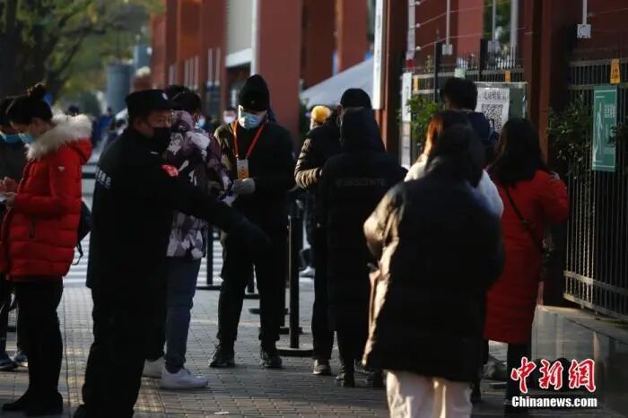 资料图:图为2020年北京市一考点外,工作人员在核验考生信息。中新社记者 蒋启明 摄