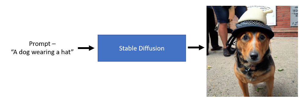 正如我们从上面的图像中看到的那样,我们可以传递一个输入的文本提示,如“戴帽子的狗”,此时稳定的扩散模型可以生成代表文本语义的图像。是不是很神奇?