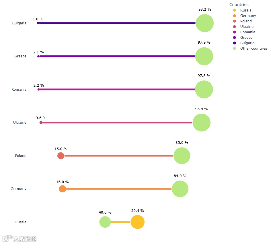 Country Percent Label_color0 Russia 59.4 Russia1 Germany 16.0 Germany2 Poland 15.0 Poland3 Ukraine 3.6 Ukraine4 Romania 2.2 Romania5 Greece 2.1 Greece6 Bulgaria 1.8 Bulgaria0 Russia 40.6 Other countries1 Germany 84.0 Other countries2 Poland 85.0 Other countries3 Ukraine 96.4 Other countries4 Romania 97.8 Other countries5 Greece 97.9 Other countries6 Bulgaria 98.2 Other countries