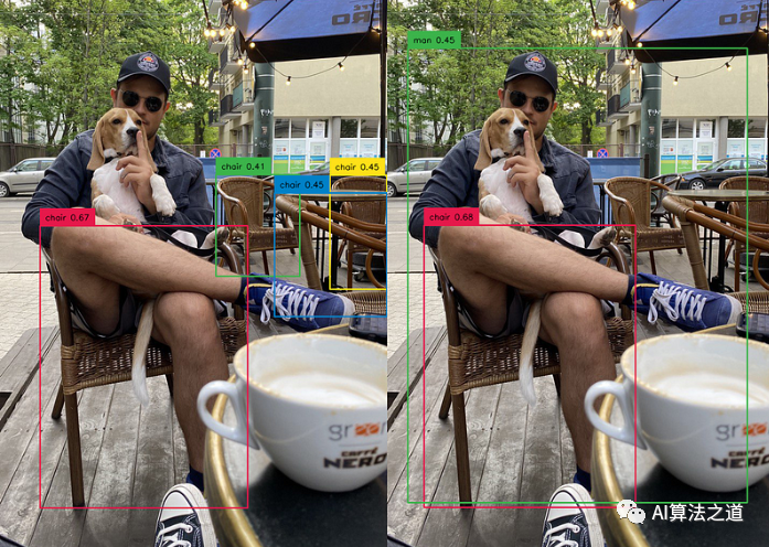 如上图所示,Grounding DINO允许根据语义进行更加精确地检测。我们可以使用文本提示词 “一个坐在椅子上的人”,来将要搜索范围缩小到仅一个人占用的椅子,而不是检测图像中所有的椅子 。我们可以看到右侧图像中,该模型不仅返回了一个检测到的椅子,还返回了一个被检测到的“男人” — 提示词中的附加词。