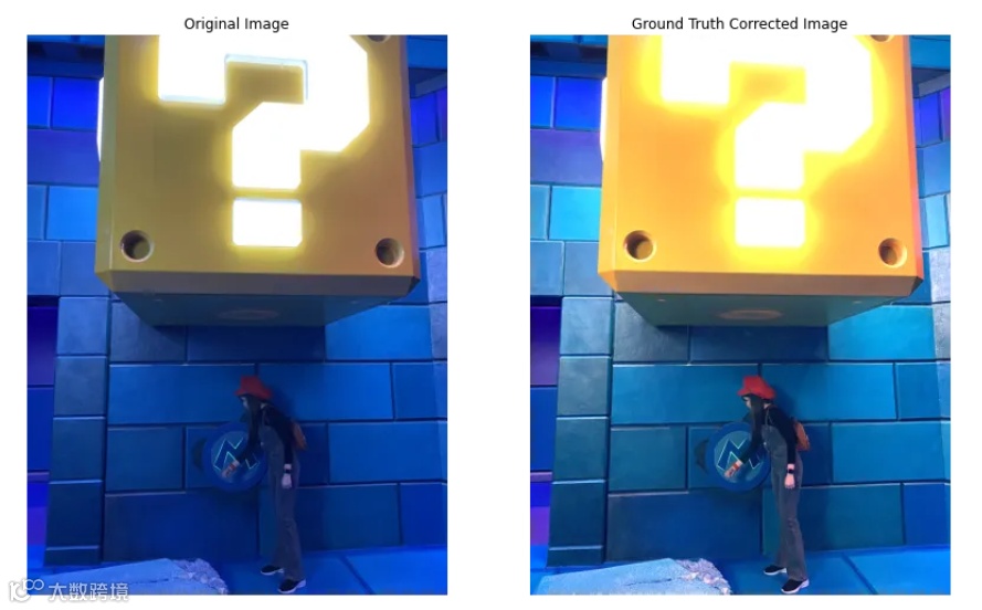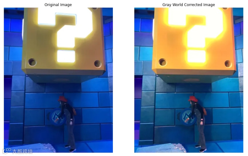 我们观察上述例子的可视化结果,可以看出基于灰色世界算法提供了比白色补丁算法更温和的结果。这主要是由于灰色平均颜色的假设,它并没有完美地将问号块转换为黄色,但红色、蓝色、白色、黑色和棕色得到了正确的增强。