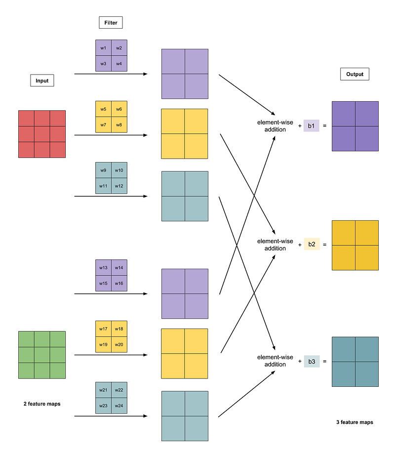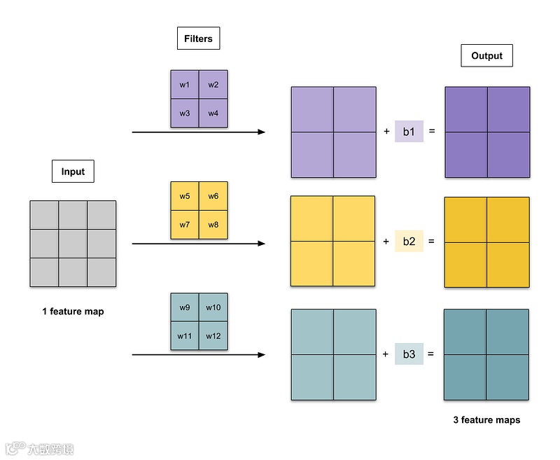 由于卷积神经网络多在计算机视觉领域得到应用,我们再来看个稍微复杂点的例子,针对2个通道输入使用3个2X2的卷积核进行卷积操作,图示如下: