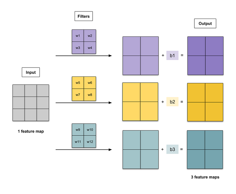 num_params = [i × (f×f) × o] + o= [1 × (2×2) × 3] + 3= 15