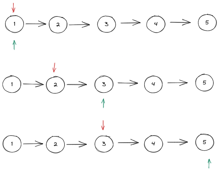 初始化:两个指针将从同一位置开始,即链表的开头。 移动:它们将朝着相同的方向移动,但第二个比第一个快。