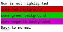 from colorama import Back, initinit()print('Now is not highlighted')print(Back.RED + 'some red background')print(Back.GREEN + 'some green background')print(Back.MAGENTA + 'some magenta background')print(Back.RESET + 'Back to normal')