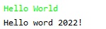 GREEN = '\033[92m'END_COLOR = '\033[0m'print(GREEN + "Hello World" + END_COLOR)print("Hello word 2022!")