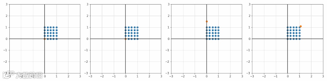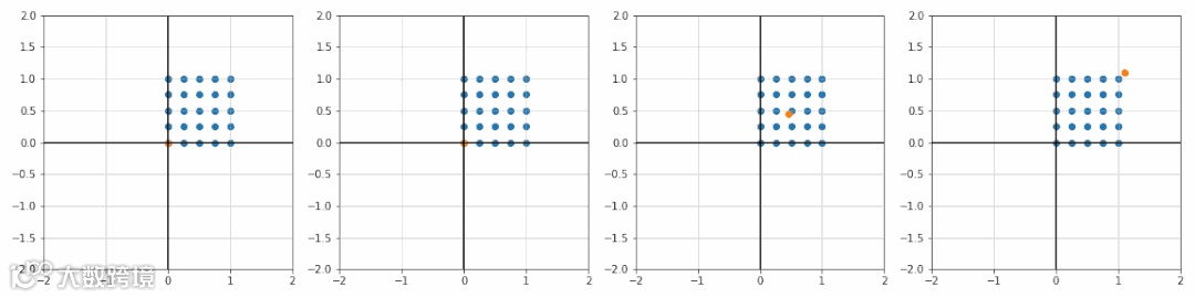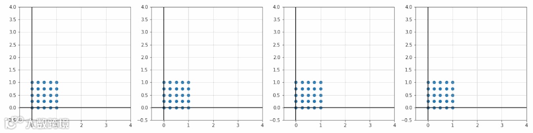 import matplotlibimport matplotlib.pyplot as pltimport numpy as npX, Y = np.mgrid[0:1:5j, 0:1:5j]x, y = X.ravel(), Y.ravel()def trans_translate(x, y, tx, ty):T = [[1, 0, tx],[0, 1, ty],[0, 0, 1]]T = np.array(T)P = np.array([x, y, [1] * x.size])return np.dot(T, P)fig, ax = plt.subplots(1, 4)T_ = [[0, 0], [2.3, 0], [0, 1.7], [2, 2]]for i in range(4):tx, ty = T_[i]x_, y_, _ = trans_translate(x, y, tx, ty)ax[i].scatter(x_, y_)ax[i].set_title(r'$t_x={0:.2f}$ , $t_y={1:.2f}$'.format(tx, ty))ax[i].set_xlim([-0.5, 4])ax[i].set_ylim([-0.5, 4])ax[i].grid(alpha=0.5)ax[i].axhline(y=0, color='k')ax[i].axvline(x=0, color='k')plt.show()