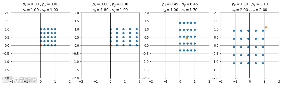 def trans_scale(x, y, px, py, sx, sy):T = [[sx, 0 , px*(1 - sx)],[0 , sy, py*(1 - sy)],[0 , 0 , 1 ]]T = np.array(T)P = np.array([x, y, [1]*x.size])return np.dot(T, P)fig, ax = plt.subplots(1, 4)S_ = [[1, 1], [1.8, 1], [1, 1.7], [2, 2]]P_ = [[0, 0], [0, 0], [0.45, 0.45], [1.1, 1.1]]for i in range(4):sx, sy = S_[i]; px, py = P_[i]x_, y_, _ = trans_scale(x, y, px, py, sx, sy)ax[i].scatter(x_, y_)ax[i].scatter(px, py)ax[i].set_title(r'$p_x={0:.2f}$ , $p_y={1:.2f}$'.format(px, py) + '\n'r'$s_x={0:.2f}$ , $s_y={1:.2f}$'.format(sx, sy))ax[i].set_xlim([-2, 2])ax[i].set_ylim([-2, 2])ax[i].grid(alpha=0.5)ax[i].axhline(y=0, color='k')ax[i].axvline(x=0, color='k')plt.show()