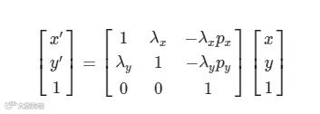 在2D空间中,对点(x,y)常用的另一种操作为相对于另一点(px,py)进行缩放操作,我们不妨x方向的缩放因子为sx,y方向的缩放因子为sy,则上述点(x,y)