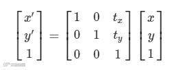在2D空间中,我们经常需要将一个点平移到另一个位置。假设空间中的一点P,其用坐标表示为(x,y);将其向 x方向平移 tx,向y方向平移ty, 假设平移后点的坐标为(x’,y’),则上述点的平移操作可以归纳为如下公式: