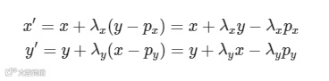 在2D空间中,对点(x,y)常用的另一种操作为相对于另一点(px,py)进行错切操作,错切一般用于弹性物体的变形处理。不妨假设沿x方向错切参数为lambdax,沿y方向的错切参数为lambday,则上述点(x,y)相对于点(px,py)的错切操作可以归纳为如下公式: