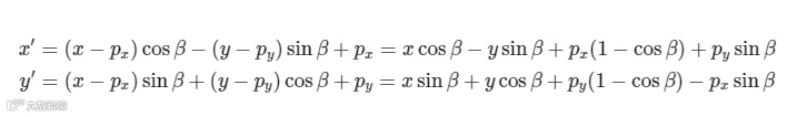 在2D空间中,对点(x,y)常用的另一种操作为相对于另一点(px,py)进行旋转操作,一般来说逆时针为正,顺时针为负,假设旋转角度为beta, 则上述点(x,y)相对于点(px,py)的旋转角度beta的操作可以归纳为如下公式: