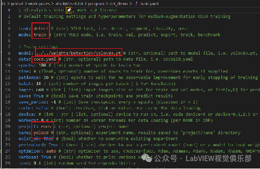 yolov8中训练参数集中在这个配置文件中,按照需要修改,龙哥编写了一键生成配置文件的程序,不用手动设定,一键即可进行训练