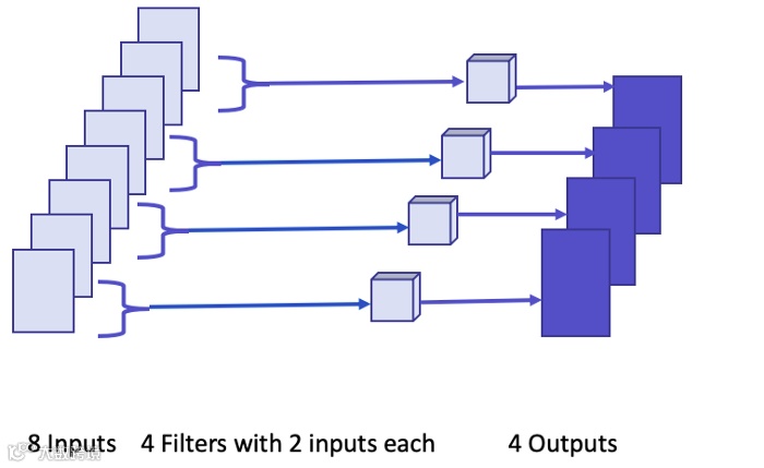 上图中,我们分了4个组,每个组中有2个通道,这表示每个过滤器采用2=8/4通道。因为组的数量等于输出通道的数量,所以每个组有一个过滤器,但是如果输出的通道数乘以f,那么过滤器的数量也将同时乘以f。