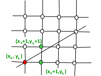 考虑到图像或者屏幕上像素的特殊性,(x,y)取值均为整数数据类型。基于此性质,我们可以每次沿着x轴增加1,接着我们来选择下一个y,此时我们有两种选择:要么y增加1要么y依旧维持不变。换句话说我们沿直线方向从点(xk,yk)移动一个像素,下一个点我们有两个选择即(xk+1,yk)或者(xk+1,yk+1)。该过程如下图所示