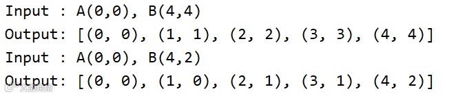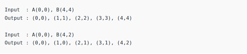 # Assumptions :# 1) Line is drawn from left to right.# 2) x1 < x2 and y1 < y2# 3) Slope of the line is between 0 and 1.# We draw a line from lower left to upperdef bresenham(x1, y1, x2, y2):: A({},{}), B({},{})".format(x1,y1,x2,y2))pt_list = []x = x1y = y1pt_list.append((x,y))fraction = 0m = (y2-y1) * 2diff_x = x2 - x1while x < x2:x = x + 1fraction += mif fraction > diff_x:y = y+ 1fraction = fraction - 2*diff_xy)):",pt_list)if __name__ == '__main__':=0, y1=0, x2=4, y2=4)=0, y1=0, x2=4, y2=2)