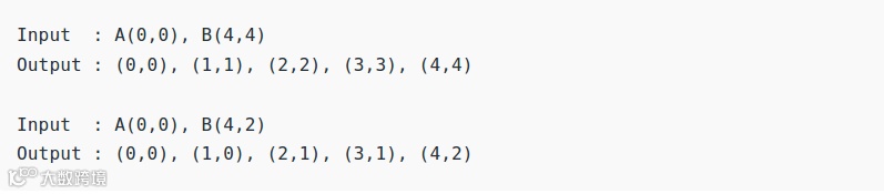 在图像处理和计算机图形学中,我们经常需要在屏幕上画直线操作。考虑给定平面上两个点A(x1,y1)以及B(x2,y2),我们的任务是实现在屏幕上画通过AB两点的直线,并找出这条直线通过的所有中间点的坐标。值得注意的是这里每个像素的坐标均为整数。
