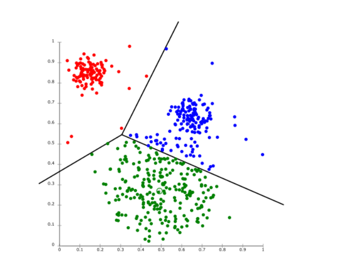 K-means 是一种成熟的算法,可用于将数据聚类为 k 个群组,二维特征空间和 k = 3 个群组的示例见下图。