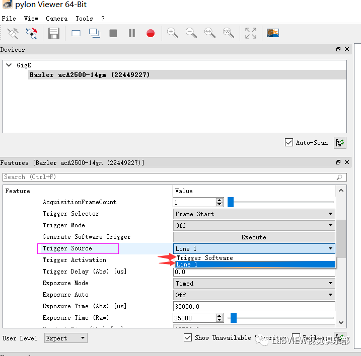 上图可以看到basler相机的触发源可选择软触发或硬触发(line)