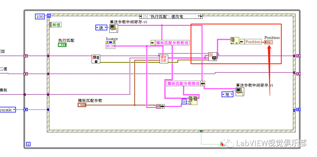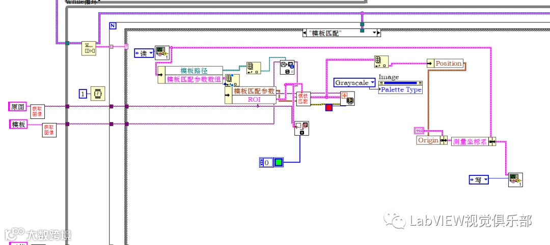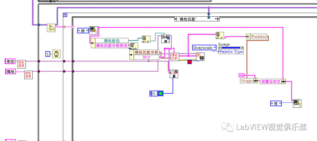 我们的测量算法中添加的第一步算法模板匹配可以通过匹配一个特征区域来得到一个坐标系,编程方式与之前的算法添加相似,通过移位寄存器存储我们设置时的参考坐标,如下图: