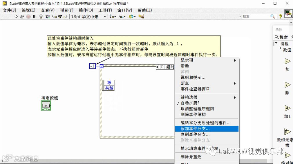 顾名思义,事件结构就是满足某个事件执行对应事件的功能分支,事件设置不可直接编辑,而是根据当前VI中所添加的控件或VI事件进行选择性编辑,如下所示: