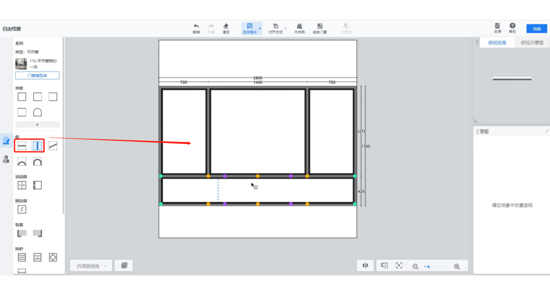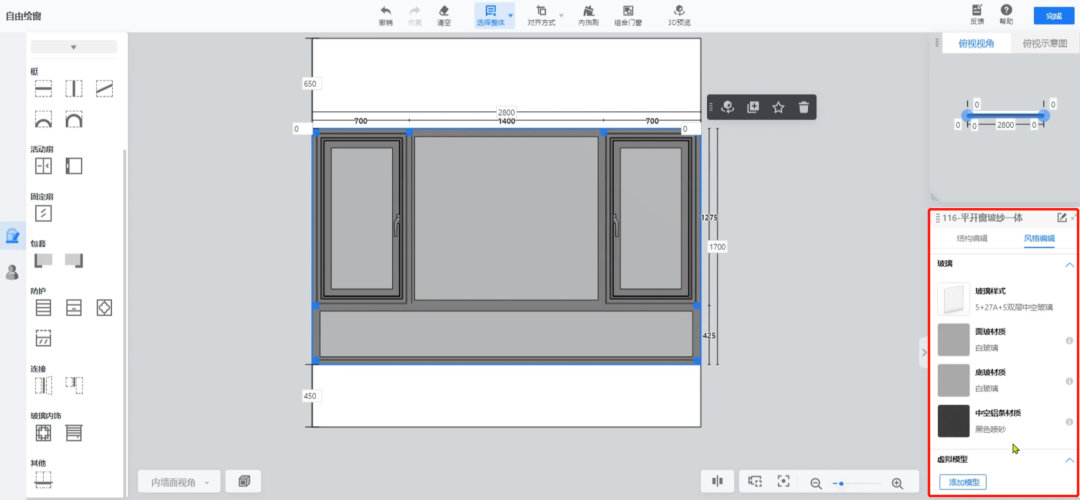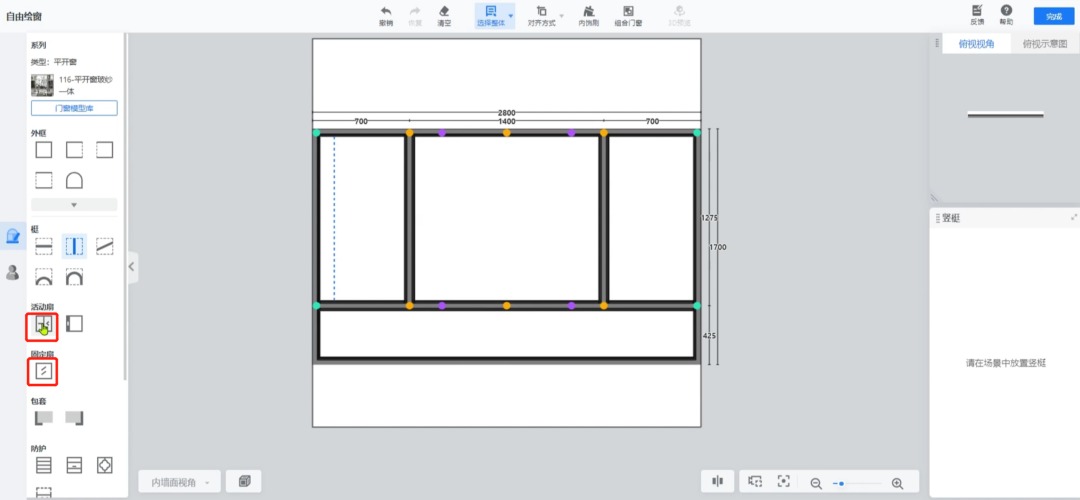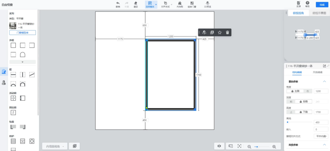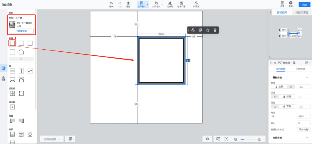 进入后,选择窗户类型,点击外框放置到画布中,并手动调整窗户的尺寸和离地高度。