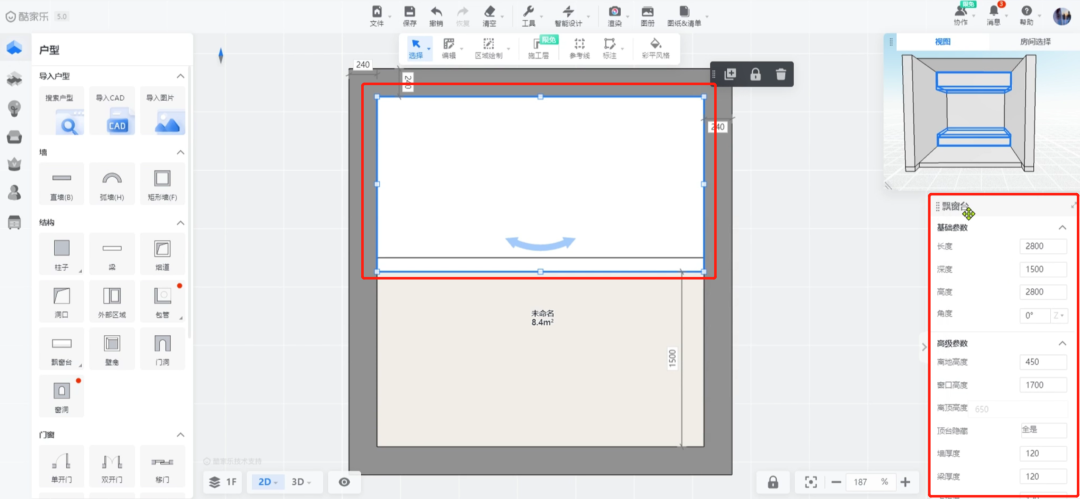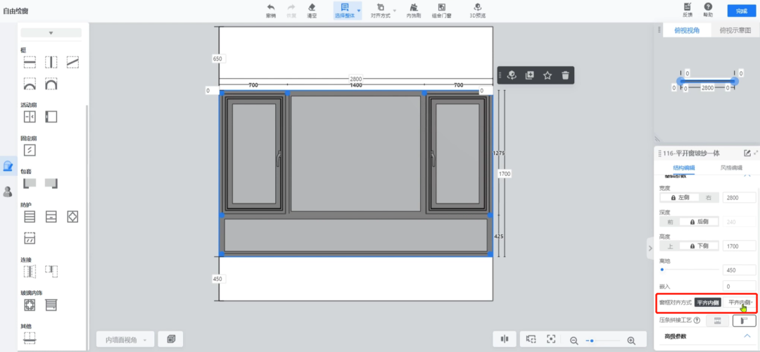 选中需要放置飘窗的墙体,点击【自由绘窗】。