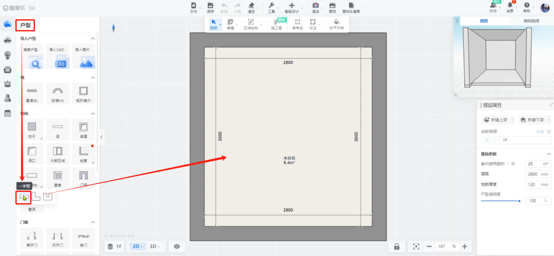 点击【户型】-【飘窗台】,选择【一字型】飘窗台,并放置到户型中。