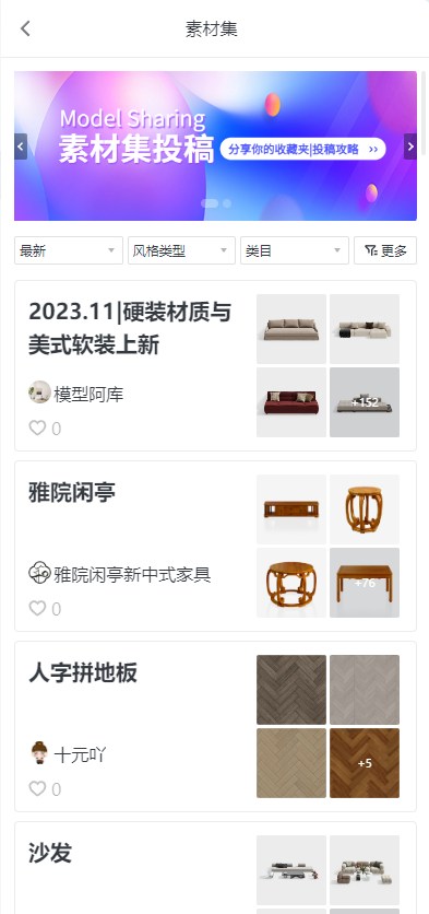 打开酷家乐素材库,点击“素材集”,即可关注海量模型。