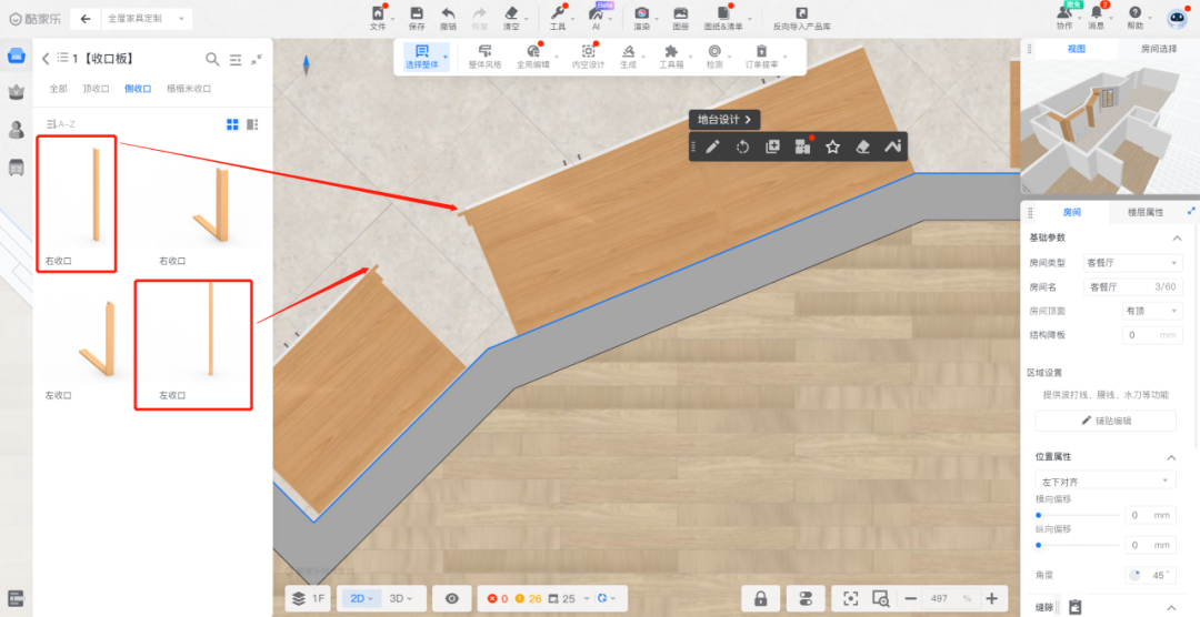选择右收口放置右侧,选择左收口放置左侧;通过托拉拽的方式将两块收口板进行拼接即可。