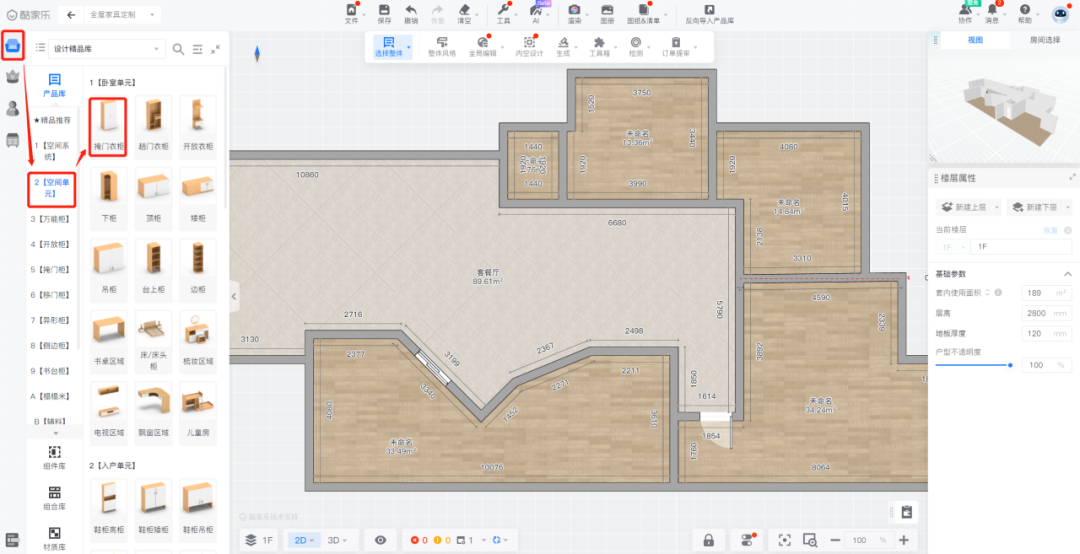 点击【公库】-【空间单元柜】-【掩门衣柜】,选择想要的柜子,并拖到指定位置。