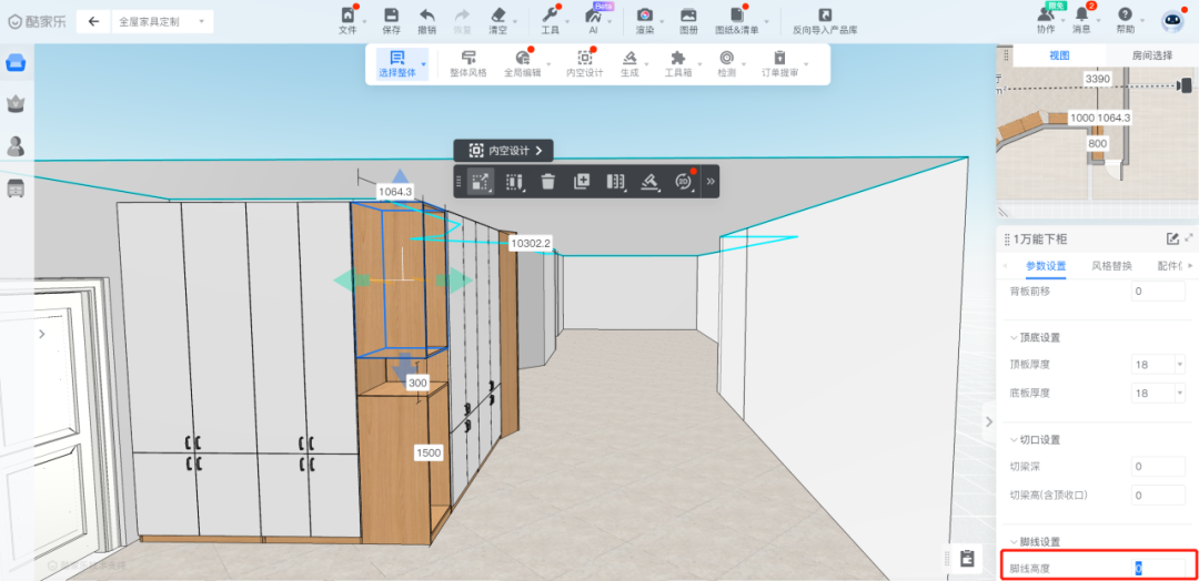 注意点:顶线生成必须保证柜体都是全屋定制或者橱柜定制。