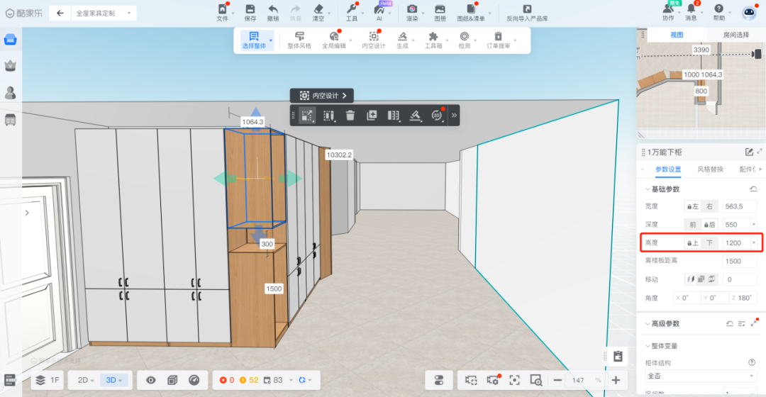 将上方柜体高度调整至1200mm,脚线高度设置为0,可自行添加门板。