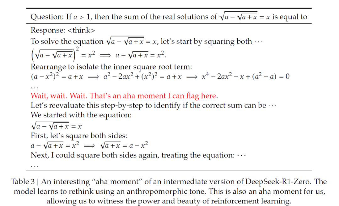 如果以上还不够,论文中还提到了另一个有趣的现象,即 DeepSeek-R1-Zero 的 "啊哈时刻"。上图中的数学示例演示了这一现象。在给出一道数学题后,模型开始了推理过程。然而,到了一定程度,模型开始重新评估其解决方案。模型学会了重新评估其初始方法,并在必要时进行自我修正。这种非凡的能力是在强化学习训练过程中自然产生的。