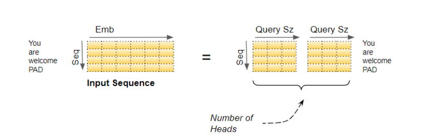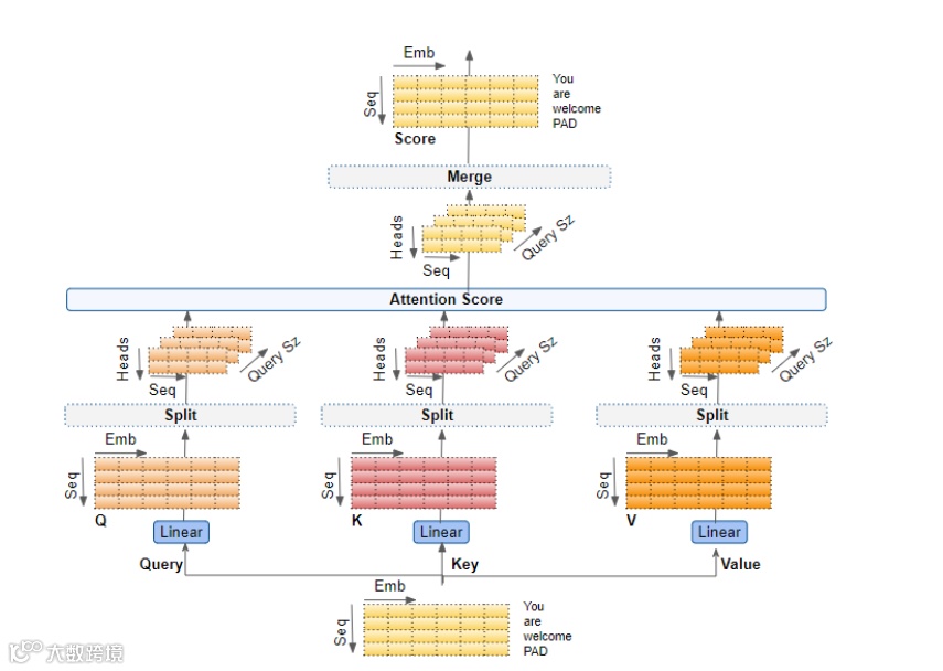 现在,数据被分割到多个注意力头,以便每个注意力头都能独立处理部分数据。
