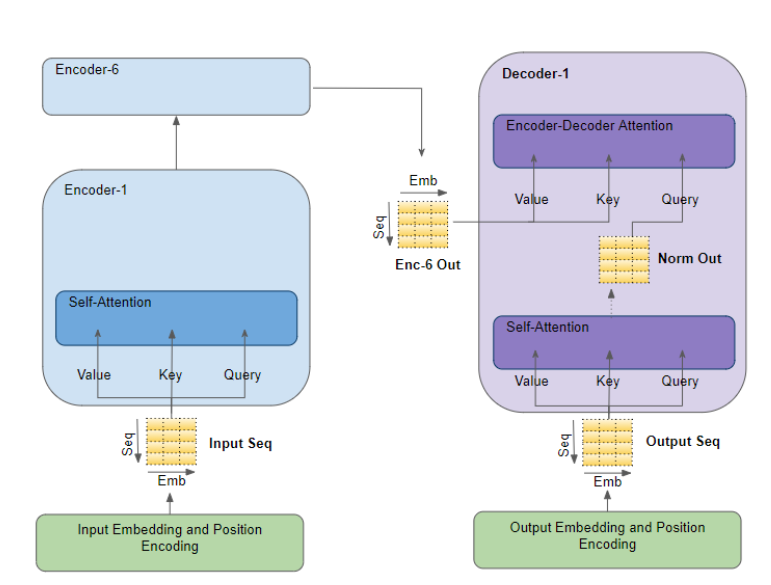 输入序列被送入嵌入层和位置编码层 ,它为输入序列中的每个单词生成相应的编码表示,以捕捉每个单词的含义和位置。该编码表示被送入第一个encoder中的自注意力层的三个参数Query,Key和Value中,通过计算注意力为输入序列中的每个单词添加相应的注意力得分;当这一过程通过编码器stack中的所有encoder时,每个注意力模块都会将自己的注意力分数添加到每个单词的编码表示中。