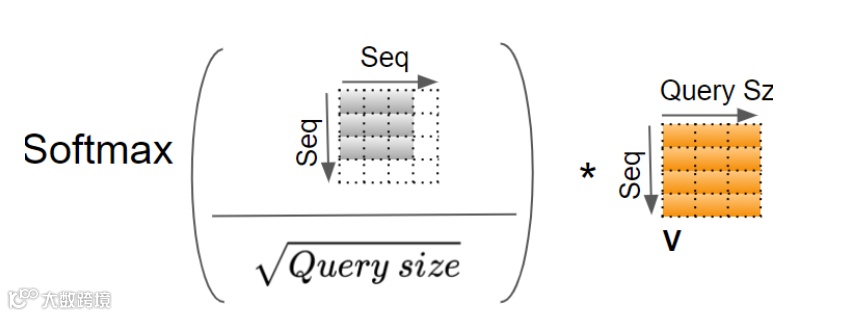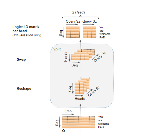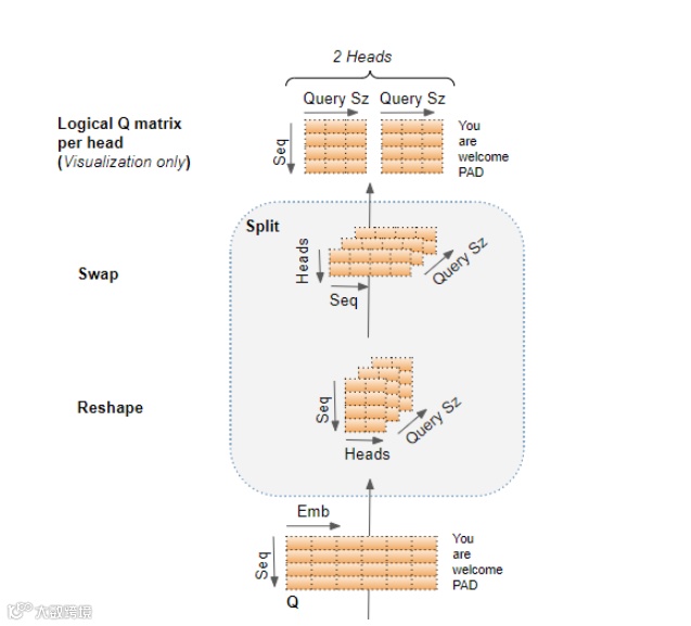 通过交换heads维度和seq维度,该矩阵再次重塑。虽然没有绘制Batch维度,但现在Q的维度已经变成了(Batch、heads、seq_len、query_size)。
