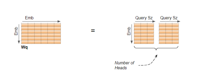 在我们的例子中,这就是QuerySize = 6/2 = 3 的原因。尽管权重(和输入数据)是一个单独的矩阵,但我们可以将其视为 "堆叠 "了每个头的单独权重。如下所示: