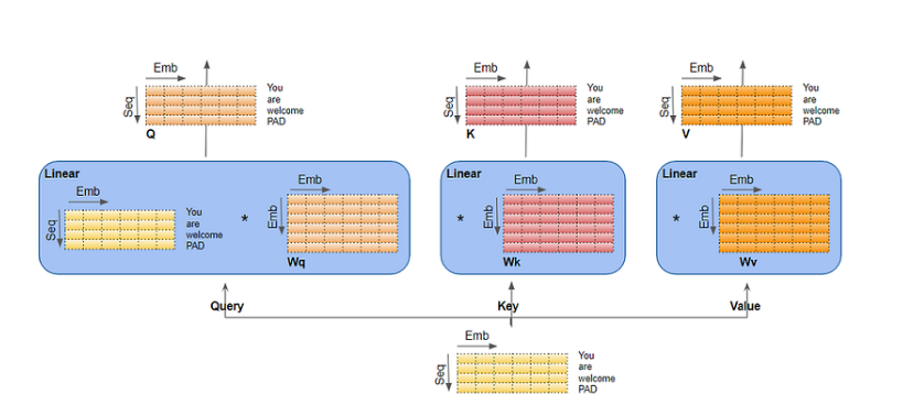 Query、Key和Value有三个独立的线性层。每个线性层都有自己的权重矩阵。输入通过这些线性层产生 Q、K 和 V 三个矩阵。
