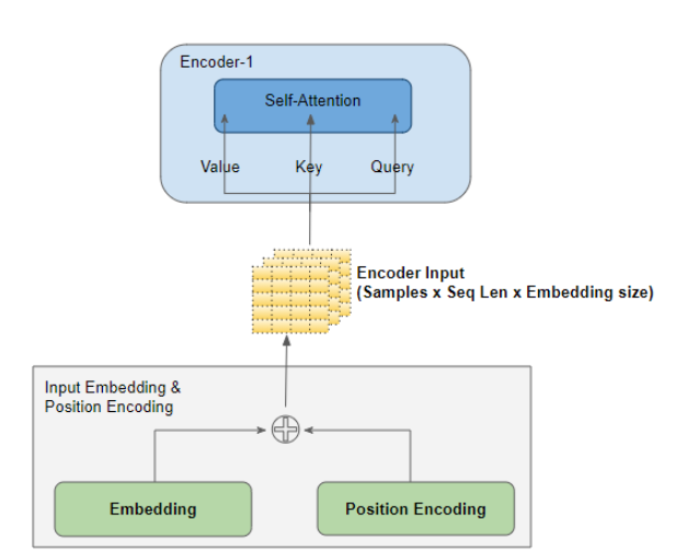 输入嵌入层和位置编码层产生一个形状矩阵(Samples,Seq_len,Embedding_size),并将其输入送到编码器stack中第一个编码器的Query、Key和Value中。
