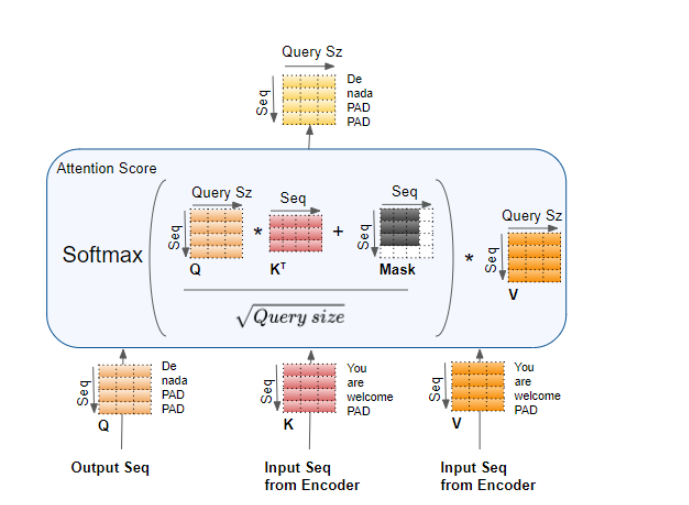 现在会在结果中添加一个掩码值。在编码器的自注意力层中,掩码用于掩盖填充值,使其不参与注意力得分的计算。在解码器的自注意力层和解码器的交叉注意力层中会应用不同的掩码,我们稍后会在流程中介绍。