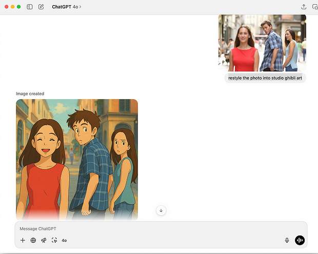 最后不得不提,GPT-4o在风格迁移方面堪称惊艳。眼下全网正被吉卜力工作室风格图像刷屏,你只需上传照片,就能让AI将其重塑成宫崎骏动画般的艺术风格。