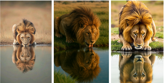 Prompt: A majestic lion kneeling near a crystal-clear water source in the savannah. It drinks slowly, its eyes fixed on the clear water, while its golden mane gently sways in the breeze. The water reflects its image, creating a perfect symmetry between the lion and its reflection.