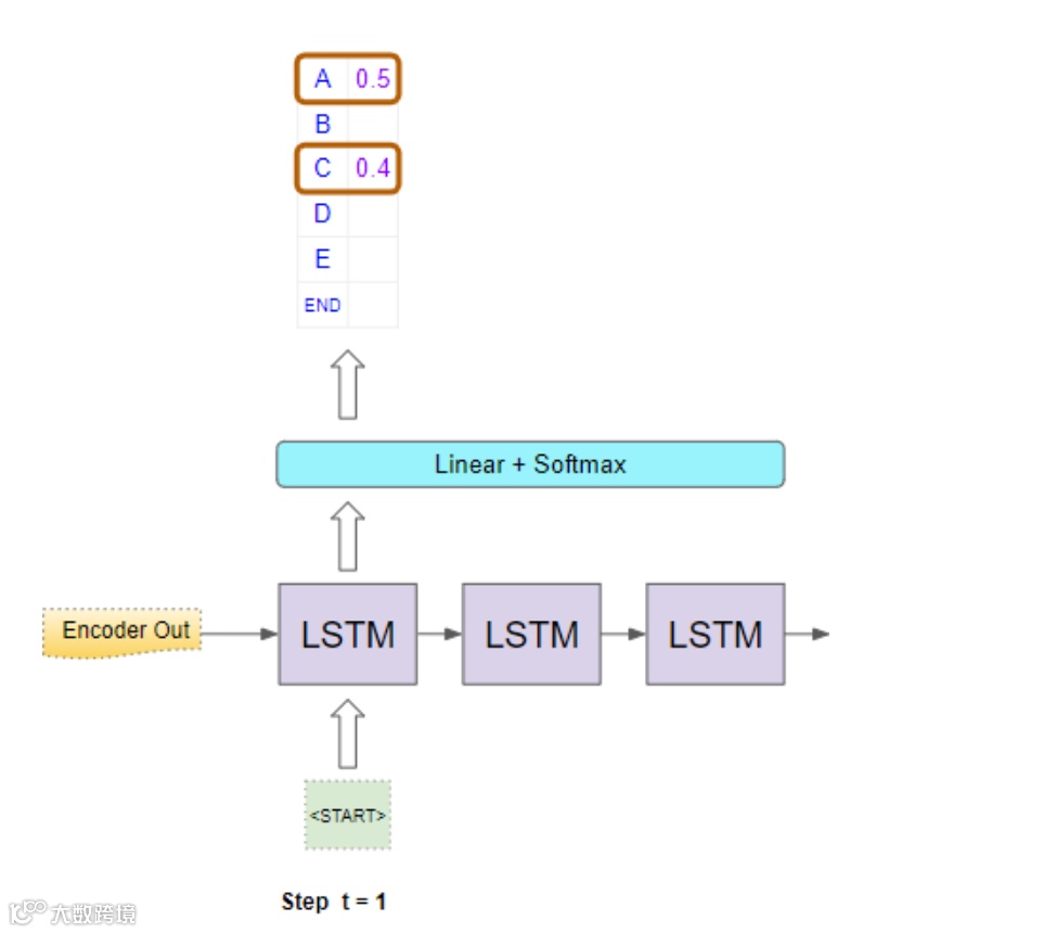 在第三个step中,解码器再次运行两次。在第一次运行解码器时,除了在第一位置输入"START"标记外,还强制第二位置和第三位置的输入分别为 "A"和 "B"。在第二次解码器运行中,它强制将第二个位置和第三个位置的输入分别设为 "A"和 "E"。
