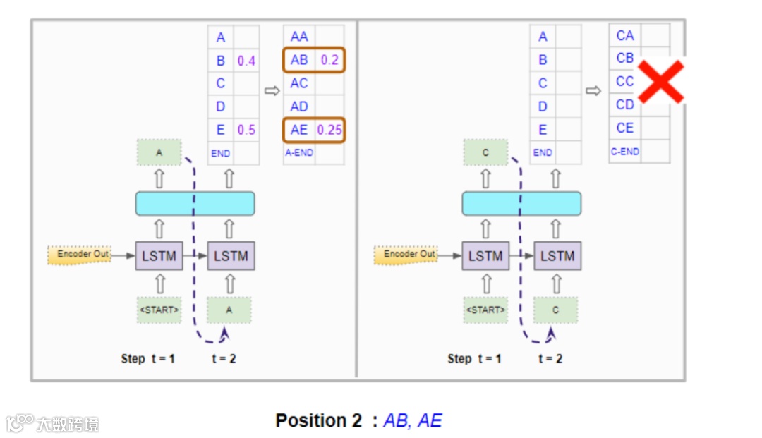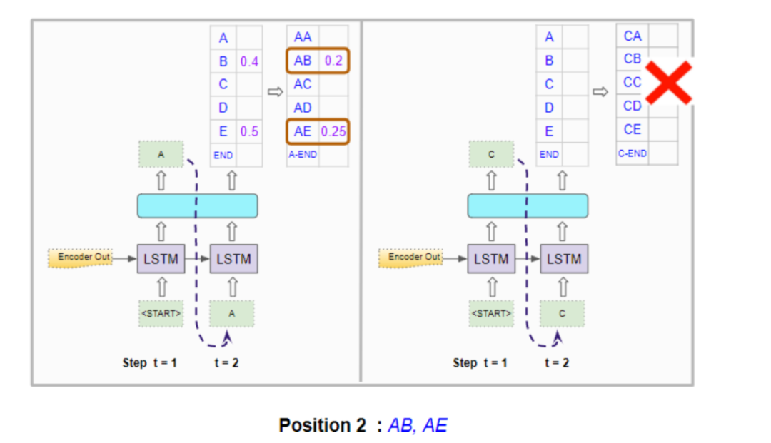 它在两次解码器运行中都是这样操作的,并挑选出两次运行中综合概率最高的字符对。因此,它会选择 "AB "和 "AE"。