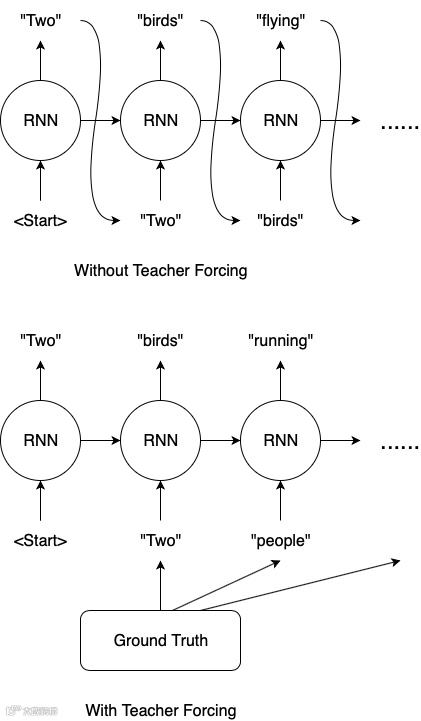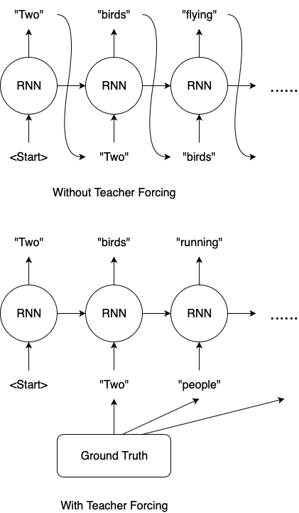 如果没有 Teacher Forcing,我们就会将单词birds反馈给我们的 RNN,作为输入来预测第 3 个单词(也可能预测错误)。 -